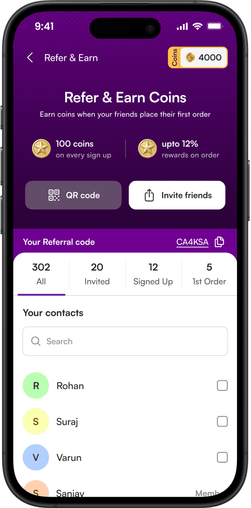 The tracker shows every stage - invited, signed up, first order placed. Both sides rewarded on conversion. Two taps to share, no navigation required.